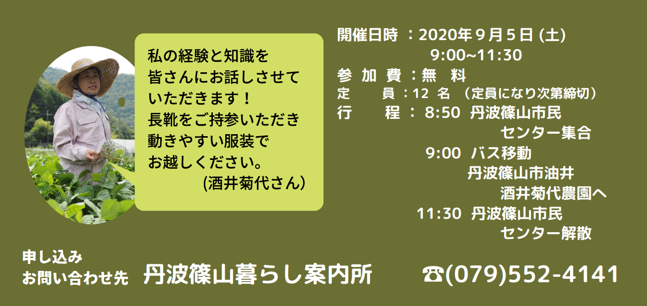 今回は、「冬野菜の準備」と題しまして〜有機農法での冬野菜の栽培の様々なコツを皆様に知っていただく内容です。講師は、丹波篠山で有機農法に45年取り組まれている 酒井菊代先生です。実体験から学べる「生きた授業」で、皆さんに本当の有機農法を語っていただきます!