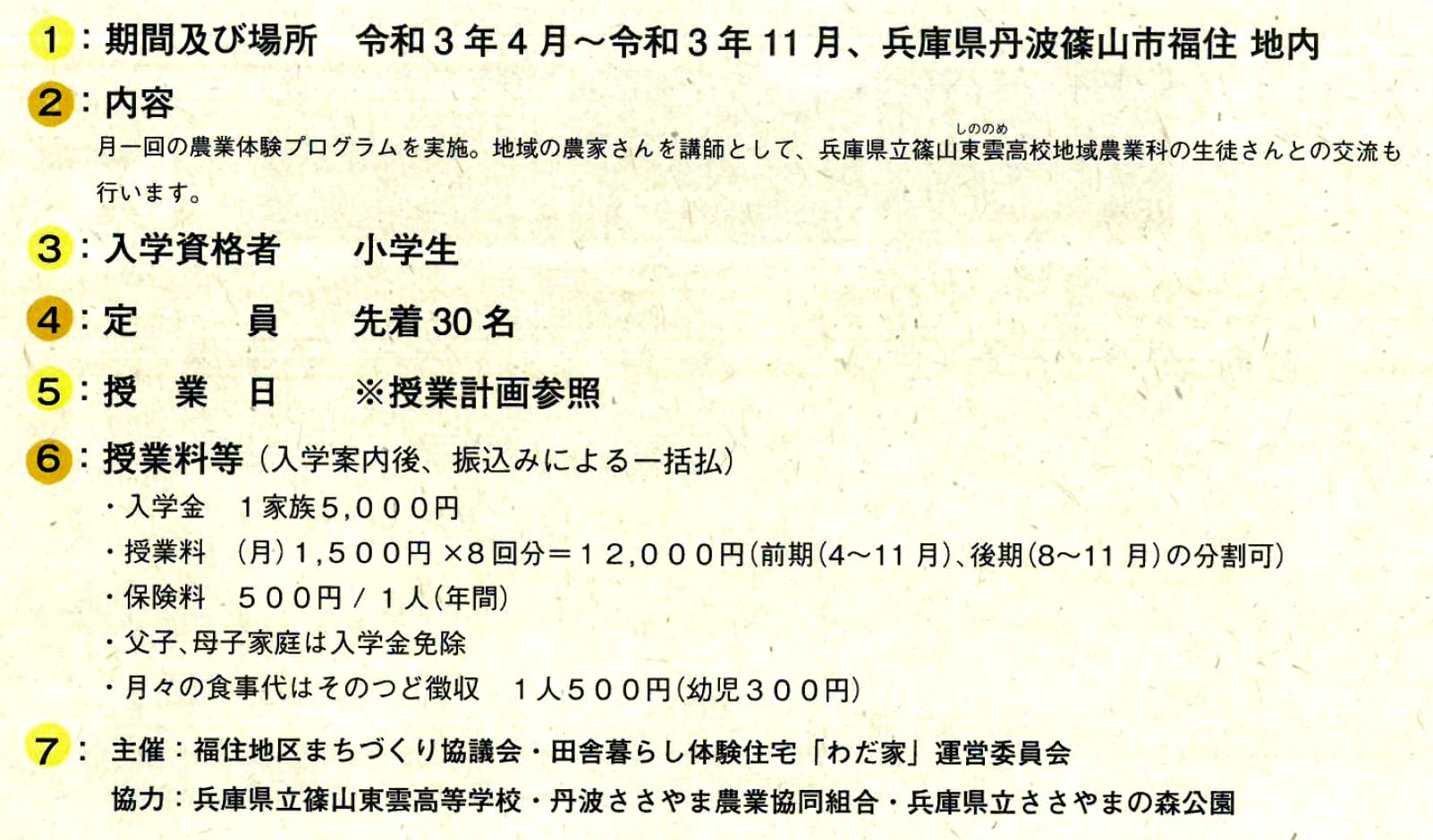 兵庫県丹波篠山市 福住地区で開催される農業体験イベント開催のお知らせ。 農業に触れながら収穫の喜び、食べ物の大切さを学ぶとともに地域間、世代間の交流を深めることができます。この機会にぜひご参加ください。 1,参加資格・内容 2,スケジュール 3,お問合せ・申込み先 ※詳細チラシPDF ※申込み用紙PDF