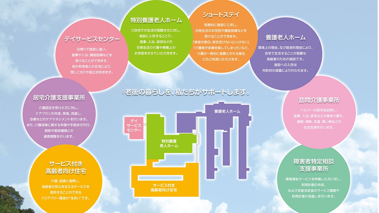 総合福祉施設です。主に高齢者介護が中心で、養護老人ホー ム、特別養護老人ホーム、短期入所、通所介護、訪問介護、サービス付き高齢者向け住宅を運営しています。