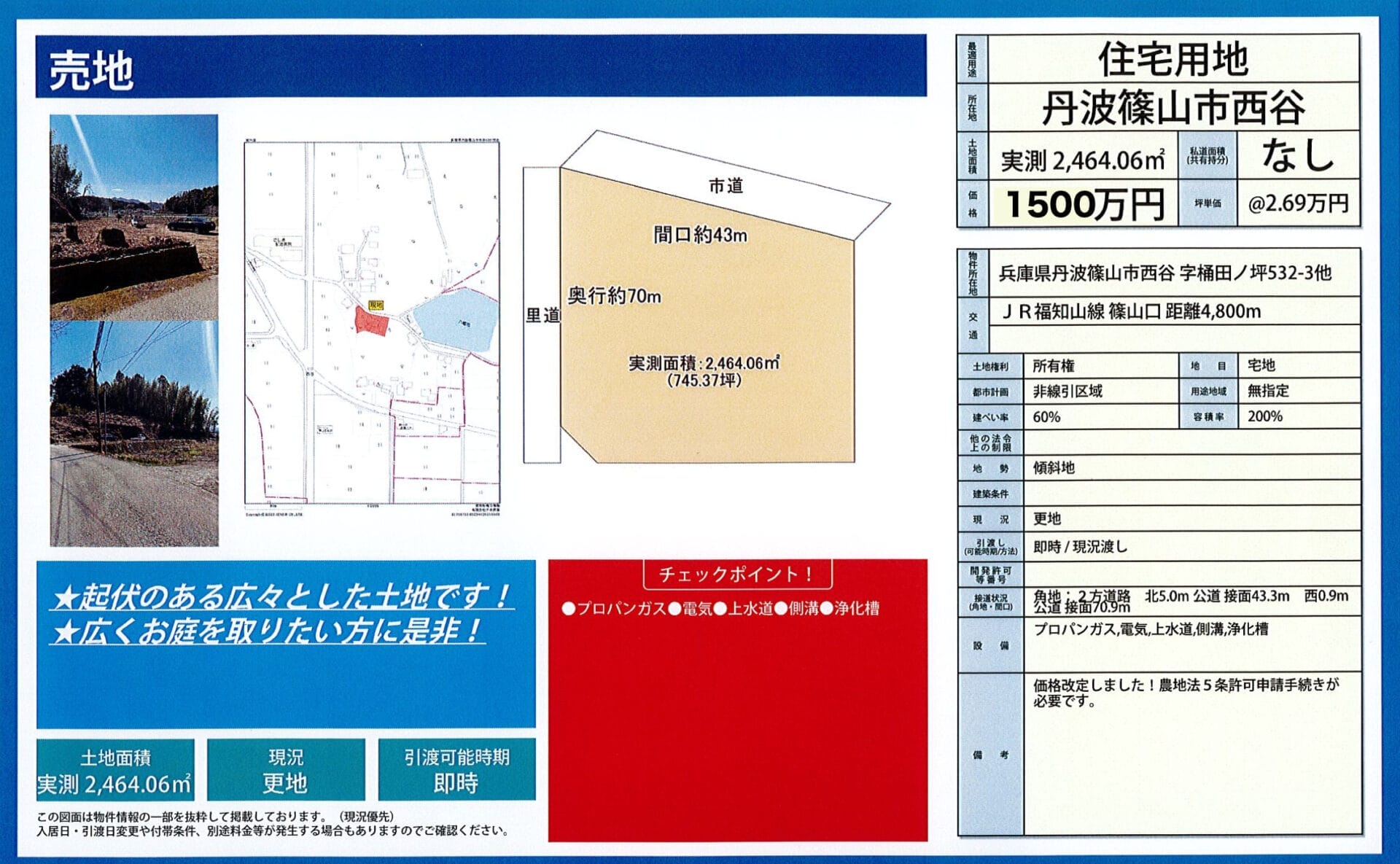 | 特記事項 | 傾斜地・農地法5条許可申請手続きが必要です。 | ||