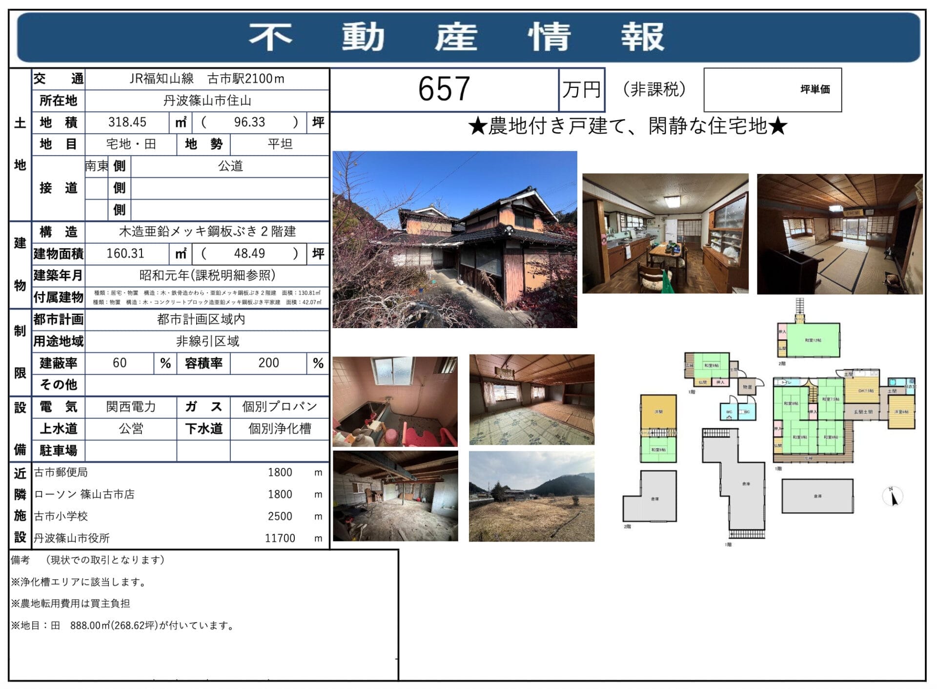 | 特記事項 | 備考 (現状での取引となります) ※浄化槽エリアに該当します。 ※農地転用費用は買主負担 ※地目:田 888.00m²(268.62坪)が付いています。・附属建物あり | ||