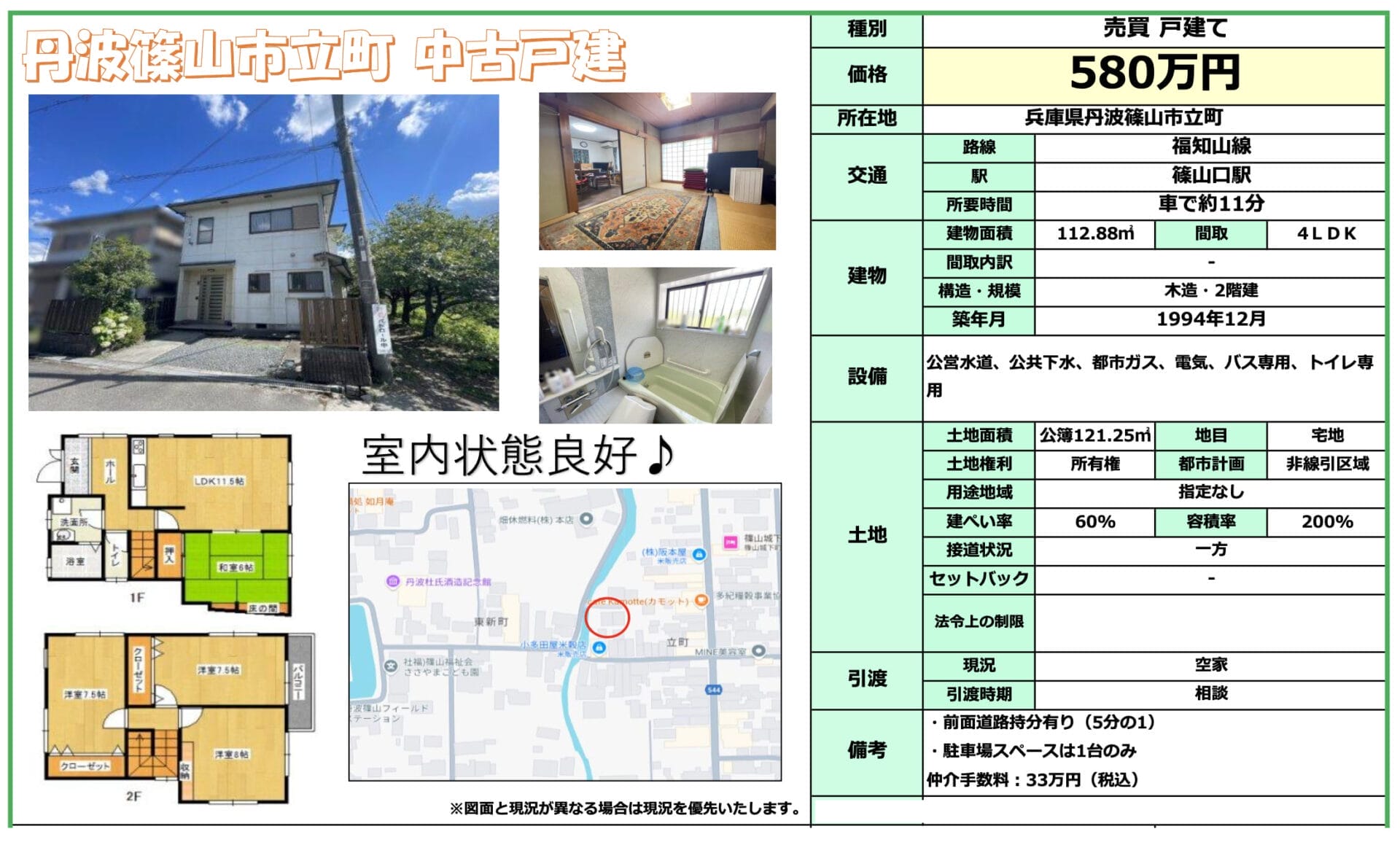 | 特記事項 | ・前面道路持分有り(5分の1) ・駐車場スペースは1台のみ 仲介手数料:33万円(税込) ※図面と現況が異なる場合は現況を優先いたします。 | ||
