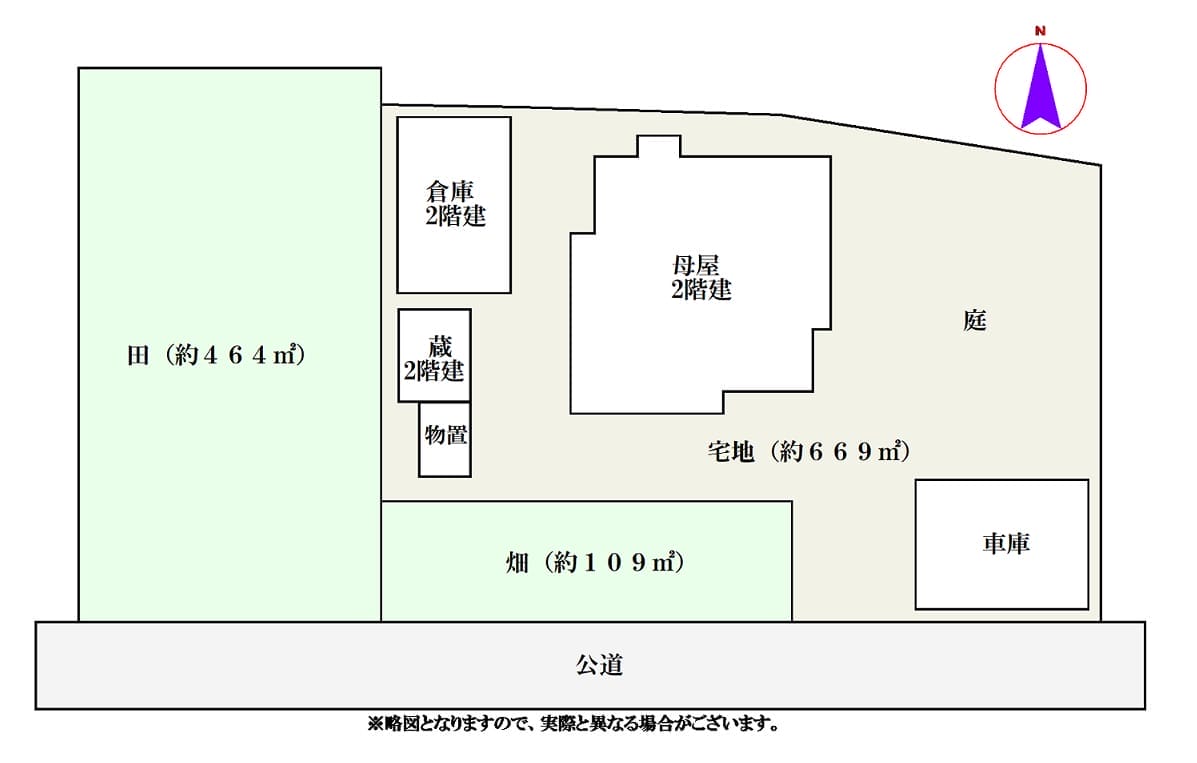 | 特記事項 | ⼟地⾯積内訳/宅地669.70㎡、農地他合 計573㎡ ■附属建物有り/倉庫(2階建)・蔵 (2階建)・⾞庫・物置。 ■建物⽼朽化による修 繕⼯事、設備等の新設⼯事が必要となります。 ■ 農地の売買につきましては農地法の許可取得が必 要となります。 ■売主の契約不適合責任免責。⼟ 砂災害警戒区域内。 地勢:平坦 | ||