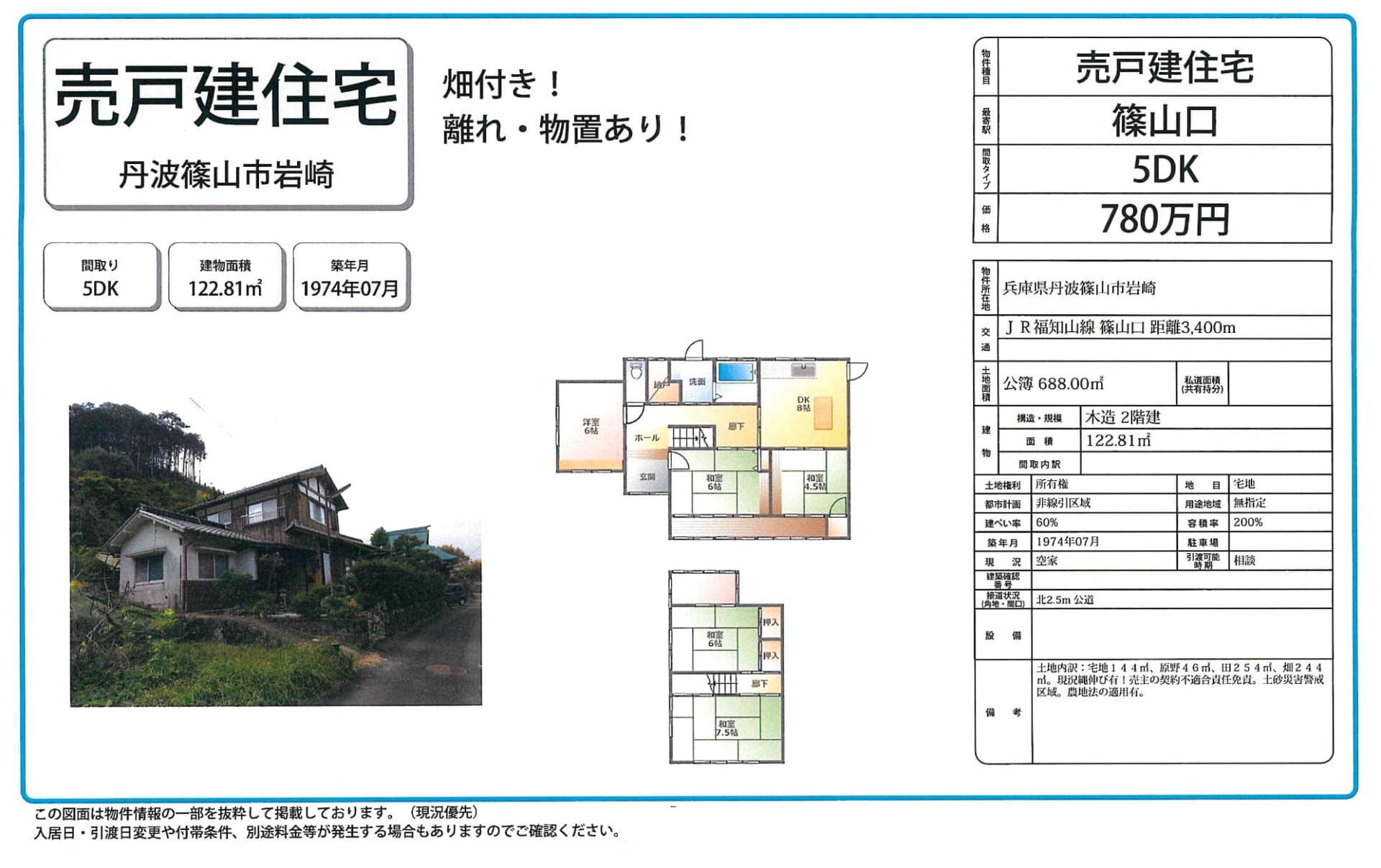 | 特記事項 | 土 地 内 訳: 宅 地 1 4 4 m 、 原 野 4 6 m 、 田 2 5 4 m l 、 畑 2 4 4 m 。 現 況 組 伸 び 有 ! 売 主 の 契 約 不 適 合 責任免責・ 農 地 法 の 適 用 有 。 土 砂災害 警戒区域。 | ||