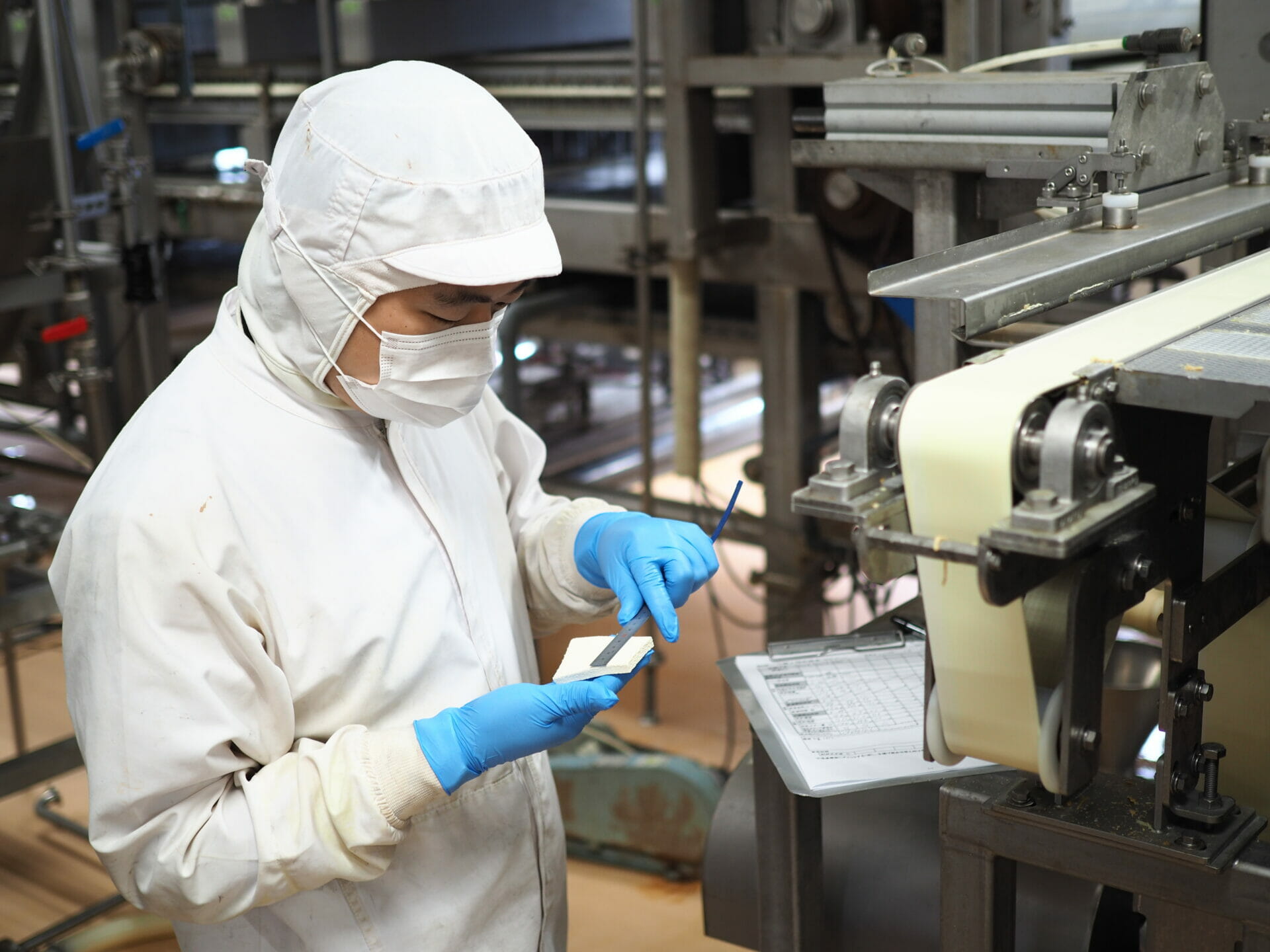 ※プレスされた豆腐の厚さを検査する中澤さん