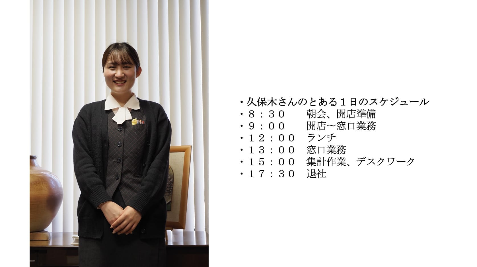 現在、窓口業務を担当する久保木さん。業務は多岐にわたり、投資信託や定期預金、保険の提案など、お客様と信頼関係を築くことが重要です。